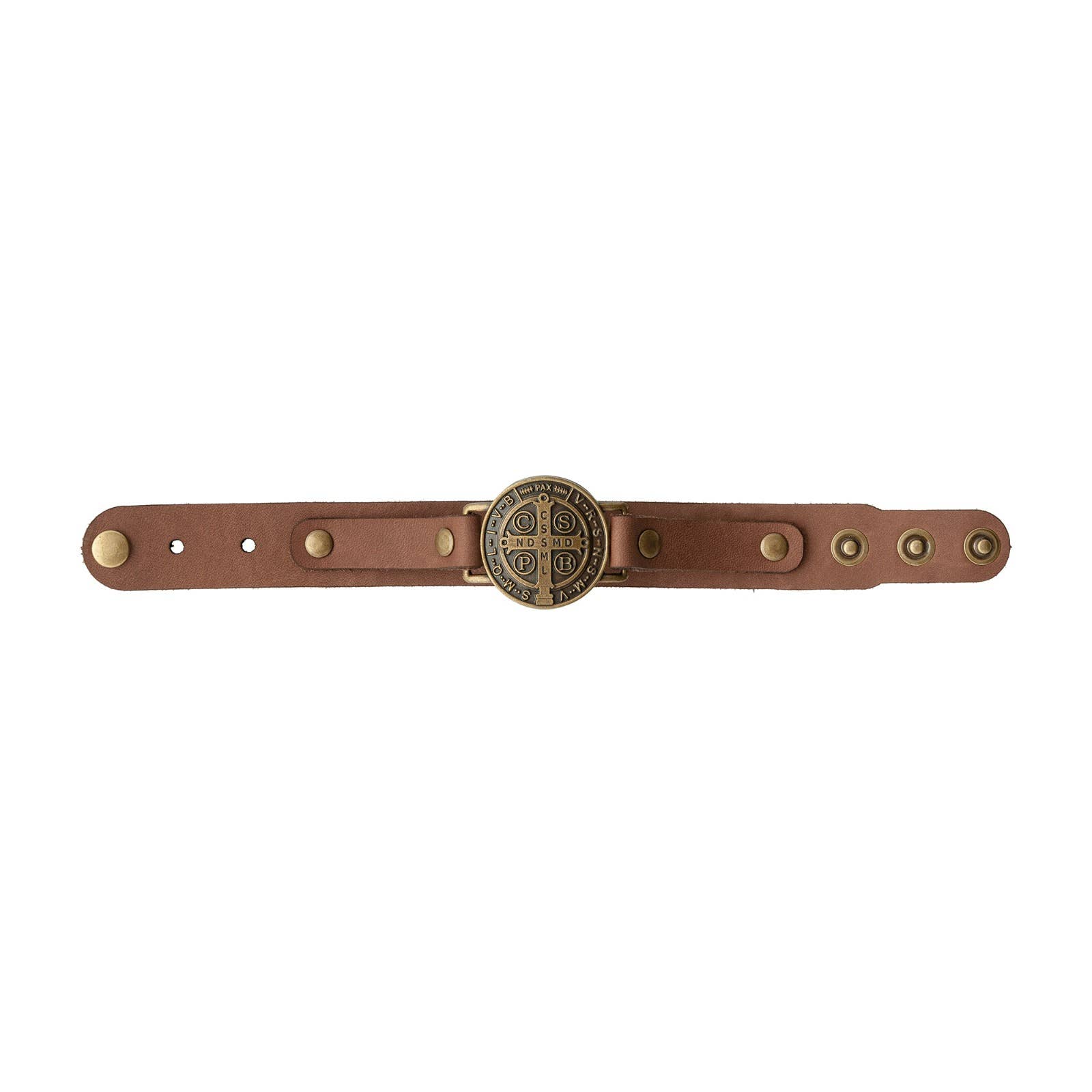 This genuine brown leather wristband features a striking gold-tone Saint Benedict medal, blending rugged style with spiritual significance—perfect for everyday wear or a meaningful Catholic gift.